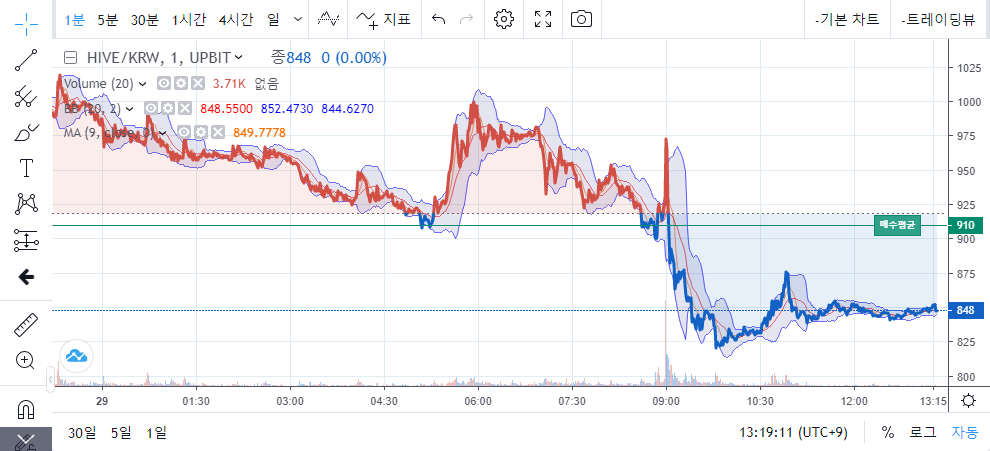 그렇게 되면 이내 거래량이 급격히 떨어지며(업비트의 경우, 체결강도), 주가는 단기 하락을 하게 됩니다.