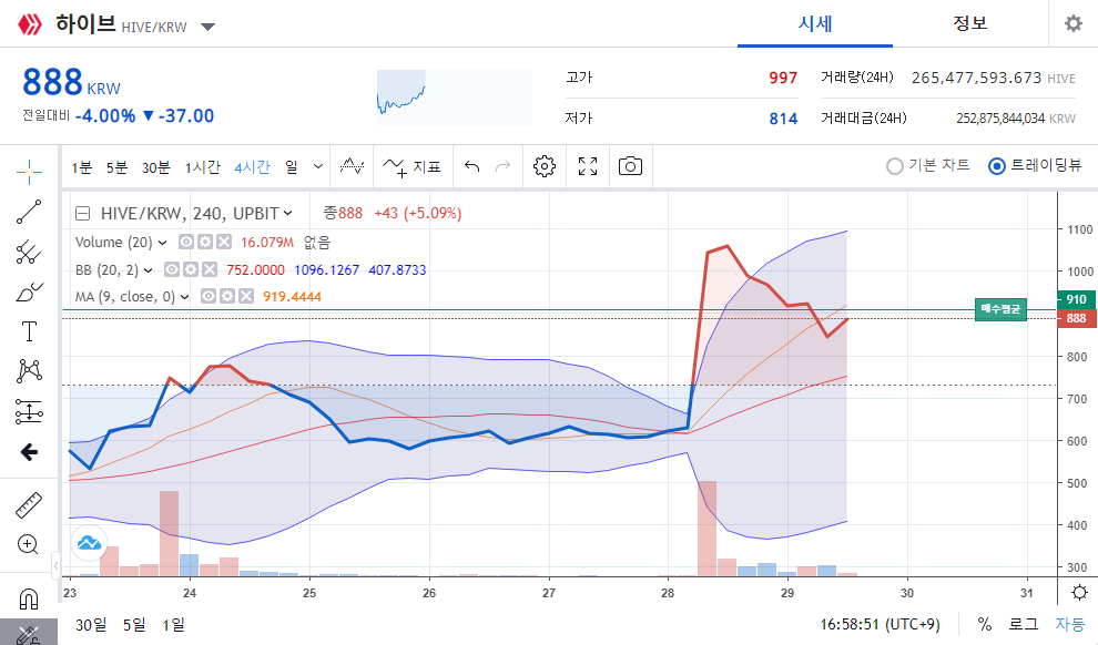 볼린저 밴드 뚫었을 때 더 올라갈 줄 알고 냅뒀더니, 바로 계단타고 내려왔다. 그렇지만 상승장이라 계속 올라갈 것으로 예상하곤 있는데, 매도 했다가 저점에서 매수했으면 더 이득을 봤을 것이다. 글을 쓰느라 놓쳐버렸지만 말이다. 어쨌거나 하이브 코인이나 하이브 코인과 비슷한 코인들이 몇 개 있다.