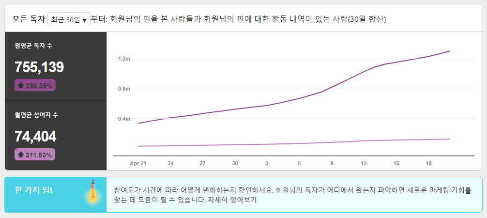 월평균 독자 수는 30일 기준으로 286.35%가 상승했고, 월평균 참여자 수는 무려 311.53%가 상승했다. 참여자 수라 하면 이미지를 클릭하고 링크로의 전환율을 말하는 것이다. 사이트에 접속을 했다면 또 클릭까지 이어지기까지 수치는 엄청나게 하락하긴 하겠지만, 그래도 안 하는 것보다 나은 결과인 것이다.