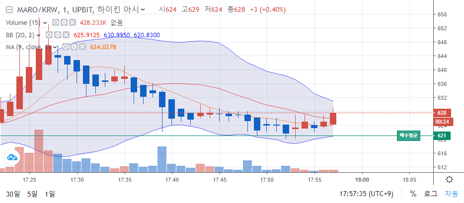 3번의 음봉 패턴이 형성되었고 그 전의 저점과 비슷하기 때문에 621이 저점으로 잡고 단타를 칠 수 있는 환경이 되었다. 바로 전의 볼린저 밴드 내에서는 618-628로 저점과 고점이 형성되었기 때문에 621로 저점을 잡았다면 628~631을 고점으로 잡고 매도를 하면 된다.