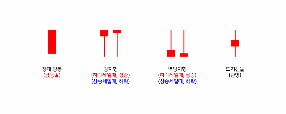 아래와 같이 해당 캔들이 등장했을 때, 대략적인 의미를 알 수 있습니다. 다만, 전체적인 흐름에 따라 조금씩 해석이 달라질 수 있으며, 기본적인 시가, 종가, 고가, 저가, 윗꼬리, 아래꼬리 등을 알면 더 쉽게 이해가 될 것입니다.