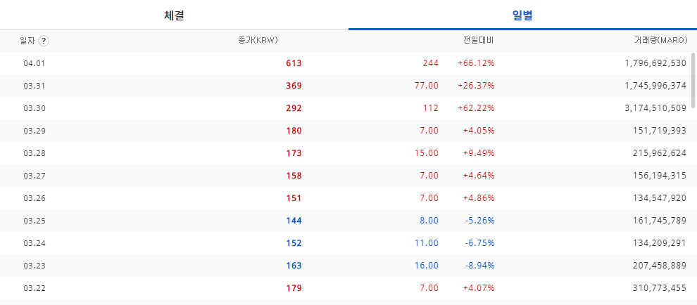 가상화폐 차트의 경우, 주식처럼 장 마감이 있는 것이 아니라서 차트 전체(일일)에 대한 시가는 오전 9시입니다. 종가는 그날 마감된 가격입니다.