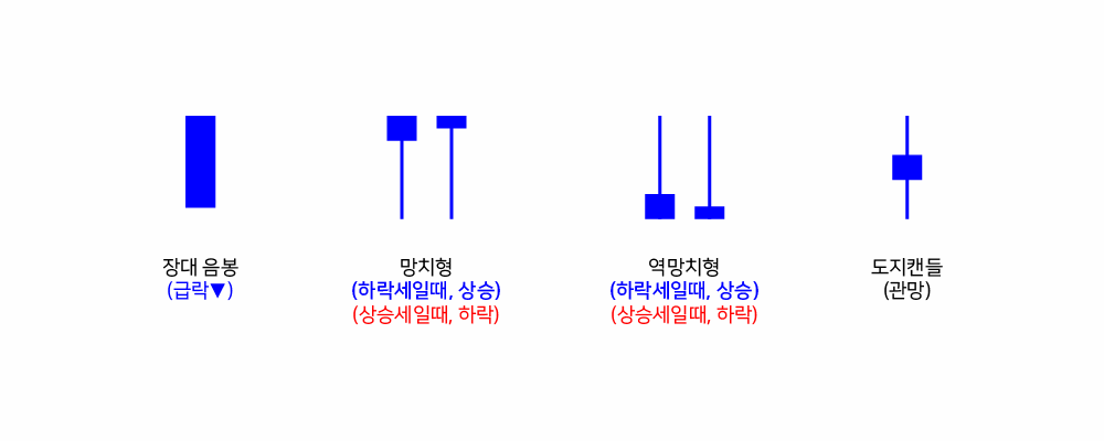 아래와 같이 해당 캔들이 등장했을 때, 대략적인 의미를 알 수 있습니다. 다만, 전체적인 흐름에 따라 조금씩 해석이 달라질 수 있으며, 기본적인 시가, 종가, 고가, 저가, 윗꼬리, 아래꼬리 등을 알면 더 쉽게 이해가 될 것입니다.