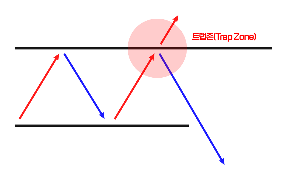 세력들은 어느 정도의 물량을 매수한 후 주가를 일시적으로 급등시키고 많은 사람들이 관심을 가지고 달려들면, 그때 가지고 있던 물량을 한 번에 매도하여 주가를 폭락시킵니다. 이렇게 하기 위해서 최대한 저렴한 시세에 매집을 하는 기간이 필요하며, 일반적으로 횡보가 길어질수록 매집할 수 있는 시간이 길어지고 트랩존이 발생할 확률이 높아집니다.
