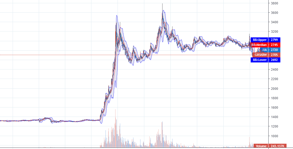 일반적인 경우, 특정 구간을 두고 일종의 매수 매도 가두리를 하는 것입니다. 이런 특정 코인의 경우 매수 벽을 쳐놓고 특정 가격 이하로는 내려가지 않습니다. 하락 구간인데도 말이죠. 그래서 차트에서도 평탄한 라인을 보여줍니다. 이 구간은 세력이 매집을 하는 과정을 보여줍니다.