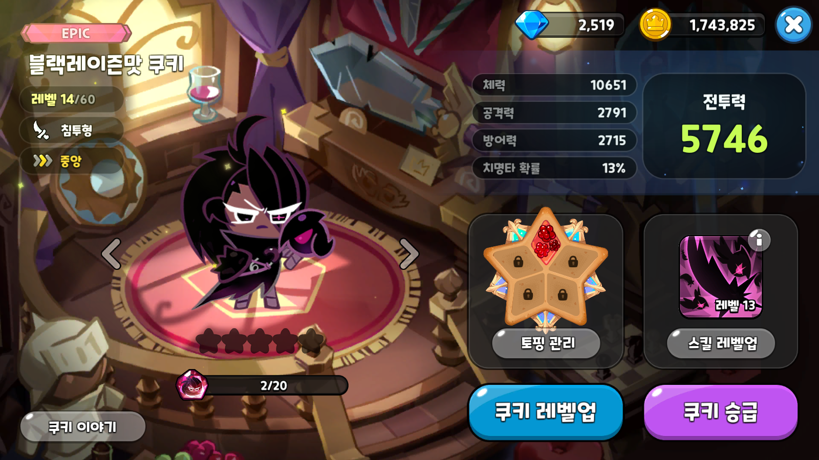 토핑은 당연히 공토핑이다. 공격력 효율이 좋기 때문에 공토핑을 사용하는 것이 좋다. 애초에, 딜러들은 보통 공토핑이 좋다. 다만, 스킬의 특징에 따라 쿨감토핑을 스왑 사용하는 경우도 많다. 블랙레이즌맛 쿠키는 무과금 유저들은 아직 육성하는데 시간이 필요하기 때문에 연구가 더 필요하지만, 아레나에서 굉장히 좋다는 평가가 있다.
