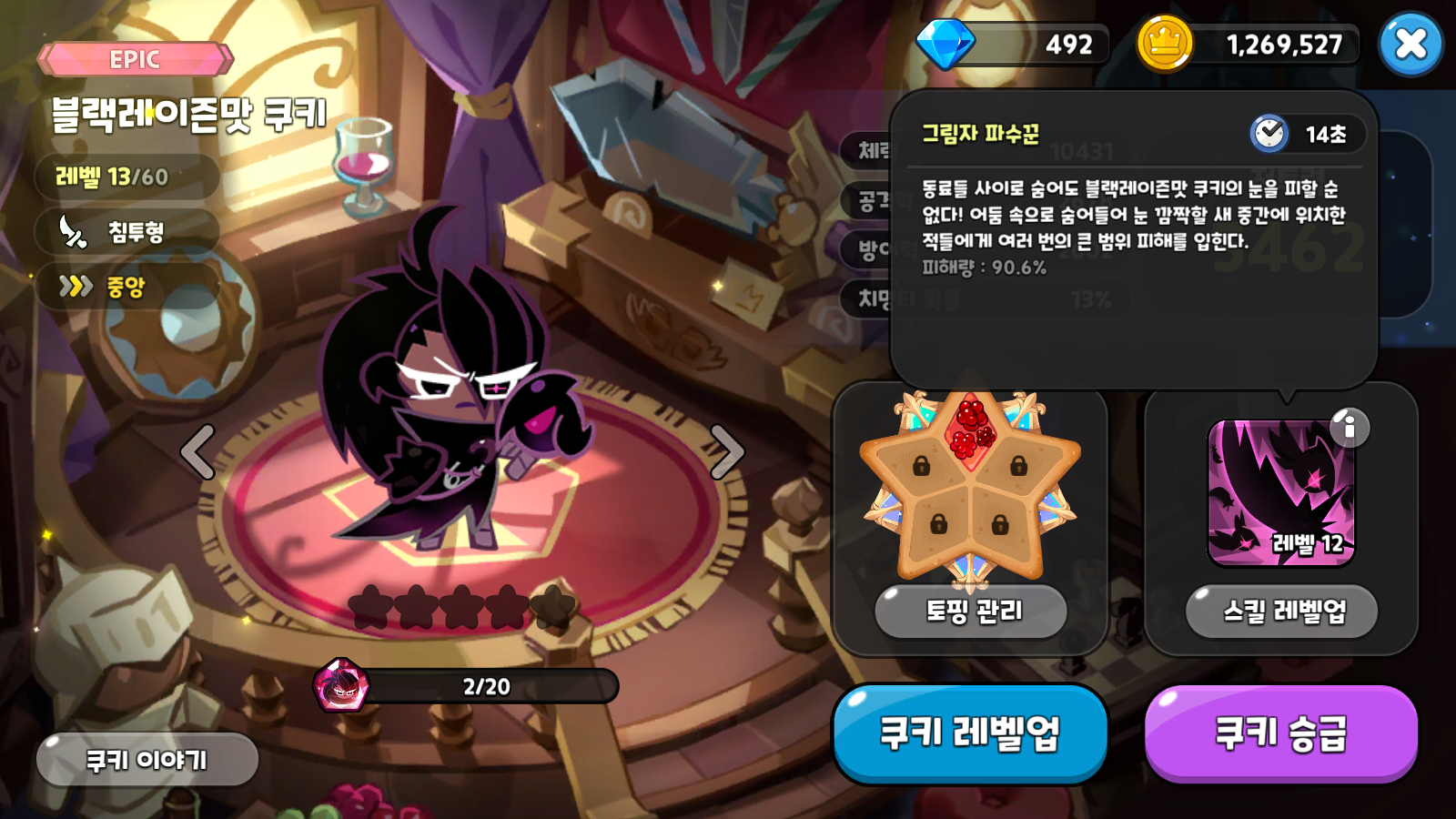 토핑은 당연히 공토핑이다. 공격력 효율이 좋기 때문에 공토핑을 사용하는 것이 좋다. 애초에, 딜러들은 보통 공토핑이 좋다. 다만, 스킬의 특징에 따라 쿨감토핑을 스왑 사용하는 경우도 많다. 블랙레이즌맛 쿠키는 무과금 유저들은 아직 육성하는데 시간이 필요하기 때문에 연구가 더 필요하지만, 아레나에서 굉장히 좋다는 평가가 있다.
