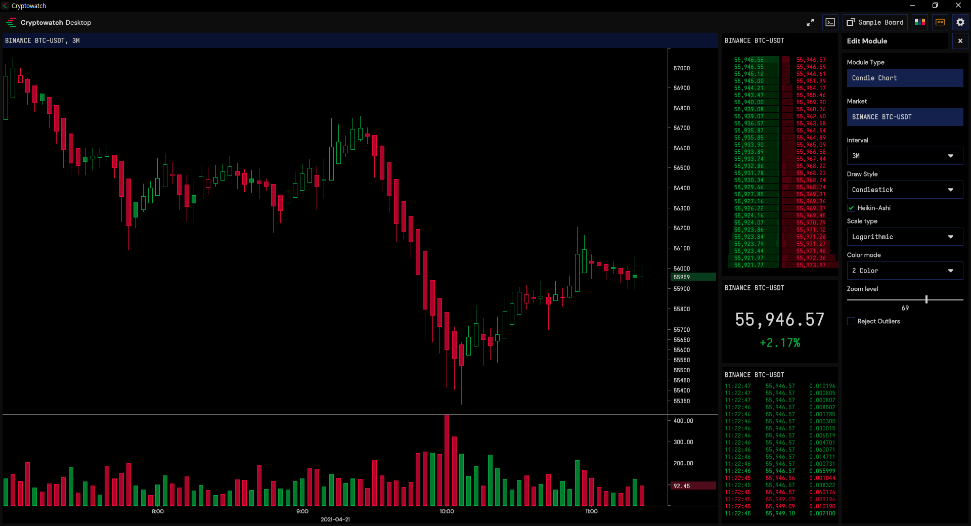 일반적인 트레이딩 차트처럼 설정할 수 있습니다. 여러 거래소의 정보와 코인들의 시세를 가져올 수 있는데, 국내 거래소에선 빗썸의 시세를 가져올 수 있습니다. 아쉽게도 업비트의 코인 시세 정보는 제공되지 않습니다. 대표적인 해외거래소인 바이낸스의 BTC(비트코인-USDT(테더) 시세로 확인할 수 있으며, ±3%로 당일 장의 분위기를 살펴볼 수 있을 것입니다.
