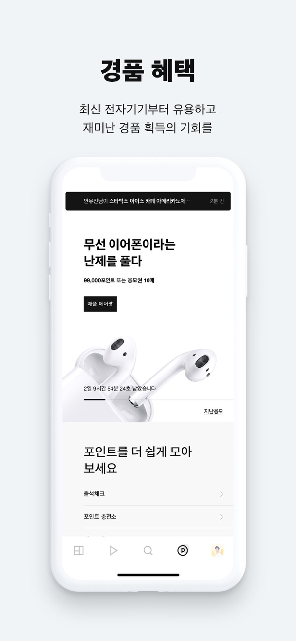 적립 받은 포인트로 최신 전자기기부터 유용하고 재미난 경품에 응모할 수 있어요.