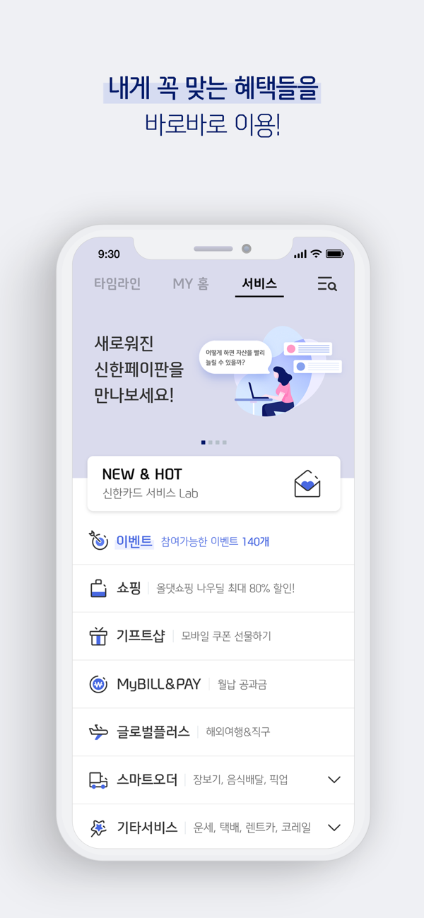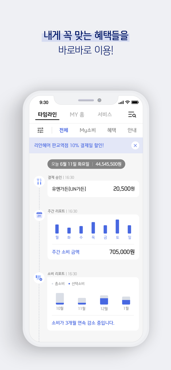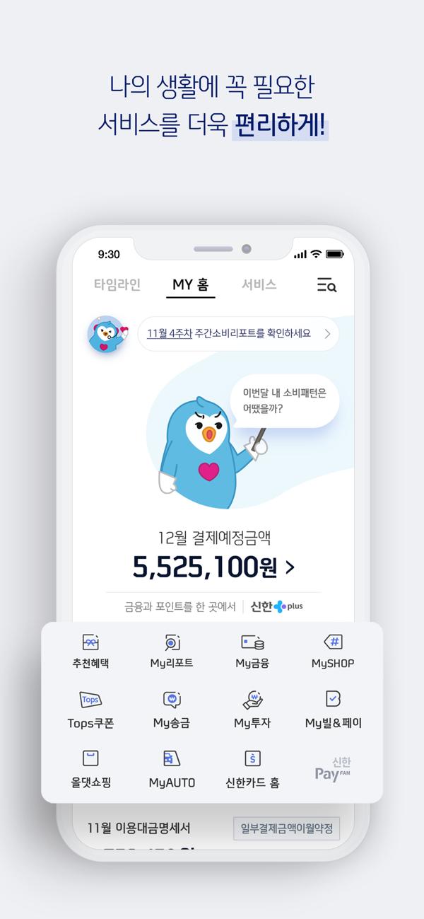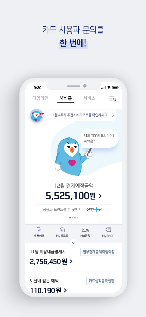 타임라인을 통해 실시간으로 승인내역 및 소비리포트를 확인하고, MY홈을 통해 신한카드 이용 시 꼭 필요한 조회/신청을 한번에 이용하실 수 있습니다.