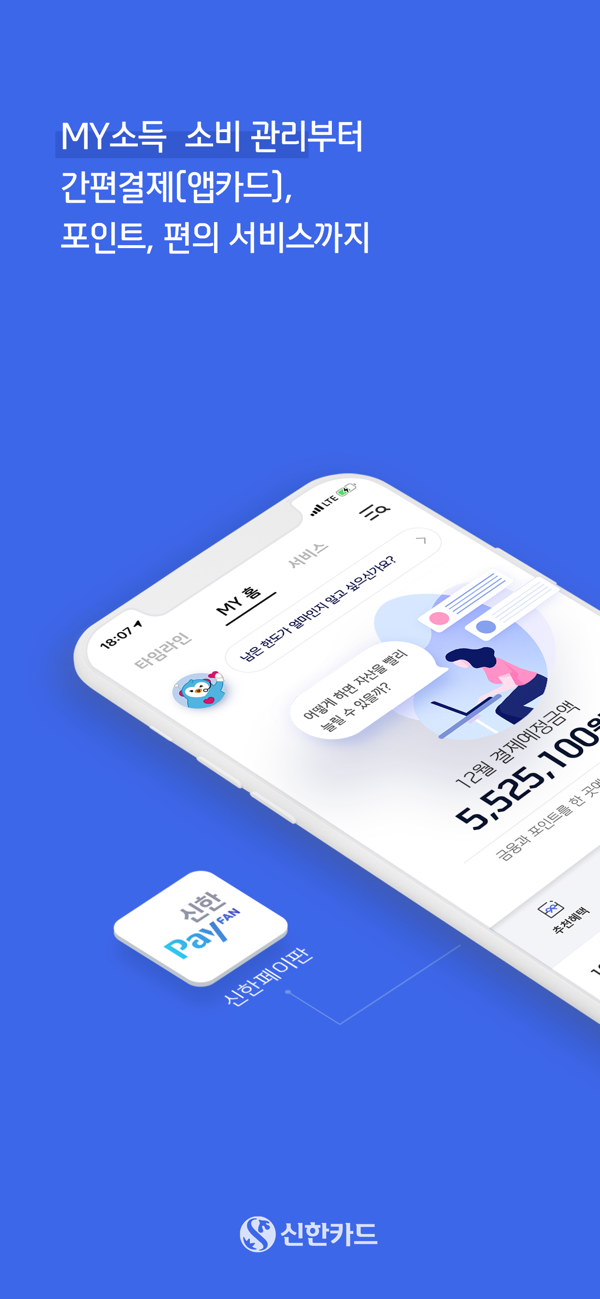 간편결제 서비스인 FAN페이를 기반으로 편리한 금융 서비스와 MY소비관리 기능을 제공하며, 타임라인, 서비스, 신한플러스를 통해 다양한 혜택을 한번에 누릴 수 있는 신한카드의 생활 플랫폼입니다.