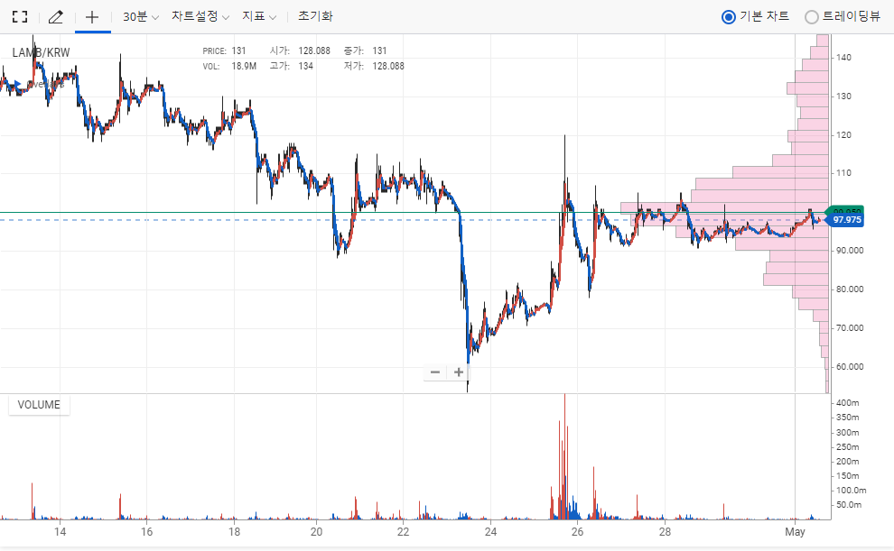 기본 차트에서 지표 - vol profile을 적용하면 우측과 같이 매물대가 적용된다. 모바일의 경우에는 영어가 아닌 한글로 표시되어 있어 쉽게 찾을 수 있다. 모바일과 다르게 %가 보이지 않아 다소 불편하고, 트레이딩 뷰에 매물대를 적용할 수 없다는 단점이 있다.