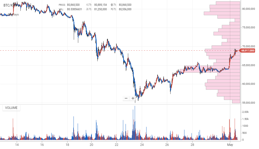 바로, 비트코인이 8,000만 원을 돌파하는 순간, 곧바로 조정이 오고 조금씩 하락하다가 4월 23일에는 유래 없는 대폭락이 시작되었습니다. 이후, 저점 매수와 동시에 6,500만 원대의 지지구간이 형성되고 곧 7,000만 원을 앞두고 있습니다. 고점에 물린 물량이 대부분 매도되었기에, 7,600만 원까지는 무리 없이 올라갈 것입니다.