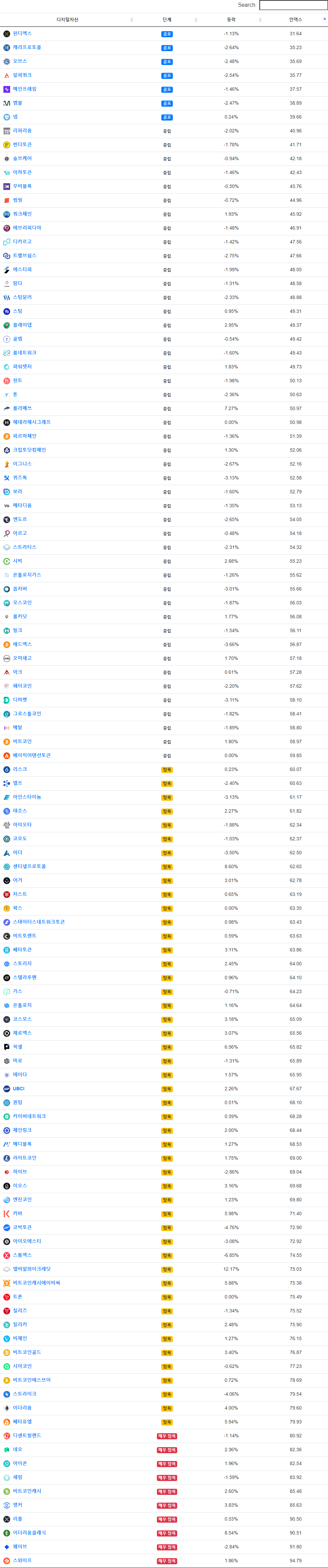 아래 테이블에서 업비트 원화시장에 상장되어 있는 암호화폐들의 개별적인 공포-탐욕 지수 현황을 확인하실 수 있습니다. (학습데이터 크기 때문에 2021년 2월 이후 상장한 디지털 자산에 대해서만 산출합니다.)