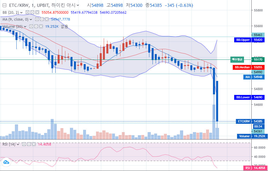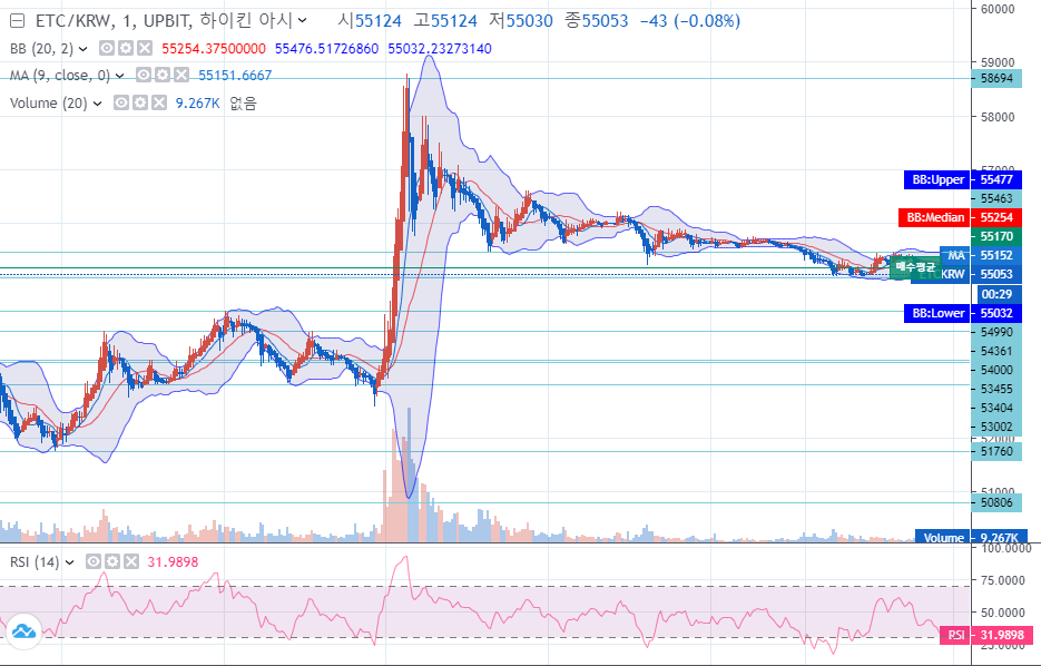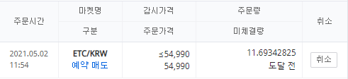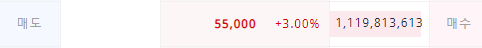 이렇게 매수를 하게 되면 가격이 55,000원 이하로 떨어지지 않습니다. 왜냐하면, 10억 매수벽이 있기 때문입니다. 이더리움을 10억 원어치 매도하지 않는다면 저 매수벽은 사라지지 않을 것입니다.
