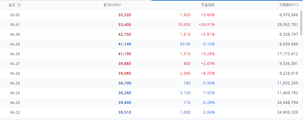 위의 이클의 경우, 어제보다 무려 24.91%가 급등했고, 오늘도 전일대비 +3.60%을 달성하고 있습니다. 보통 이런 종목은 쉽게 진입하기가 어렵습니다. 리스크를 감당해야 하기 때문입니다. 아주 단순하게, 급등한 종목은 다음 날 급락할 가능성이 크기 때문입니다. 그런데, 이더리움클래식처럼 거래대금이 몰리는 종목의 경우에는 조금 경우가 다릅니다.