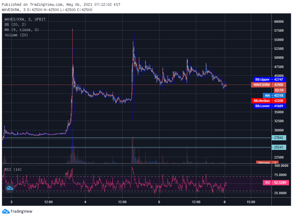 웨이브 코인은 최근 이더리움 클래식과 도지코인처럼 엄청난 급등을 했다. 첫 슈팅은 2,8000원 그리고 두 번째 슈팅이 38,000원에서 시작됐다. 50,000원 전후반에 고점을 형성하고 42,000원 정도에 저점을 형성했다. 전형적인 펌핑 앤 덤핑 코인인데, 저점 이후에 계속 횡보하다가 40,000원 아래로 떨어지게 되면 한 번에 급락할 가능성이 매우 크고, 반대로 42,000원 대에 계속 저점을 형성하면서 조금씩 상승한다면 50,000원 이상의 큰 펌핑이 한 번 정도는 나올 것이라 예상한다.