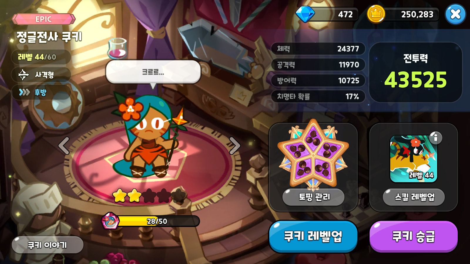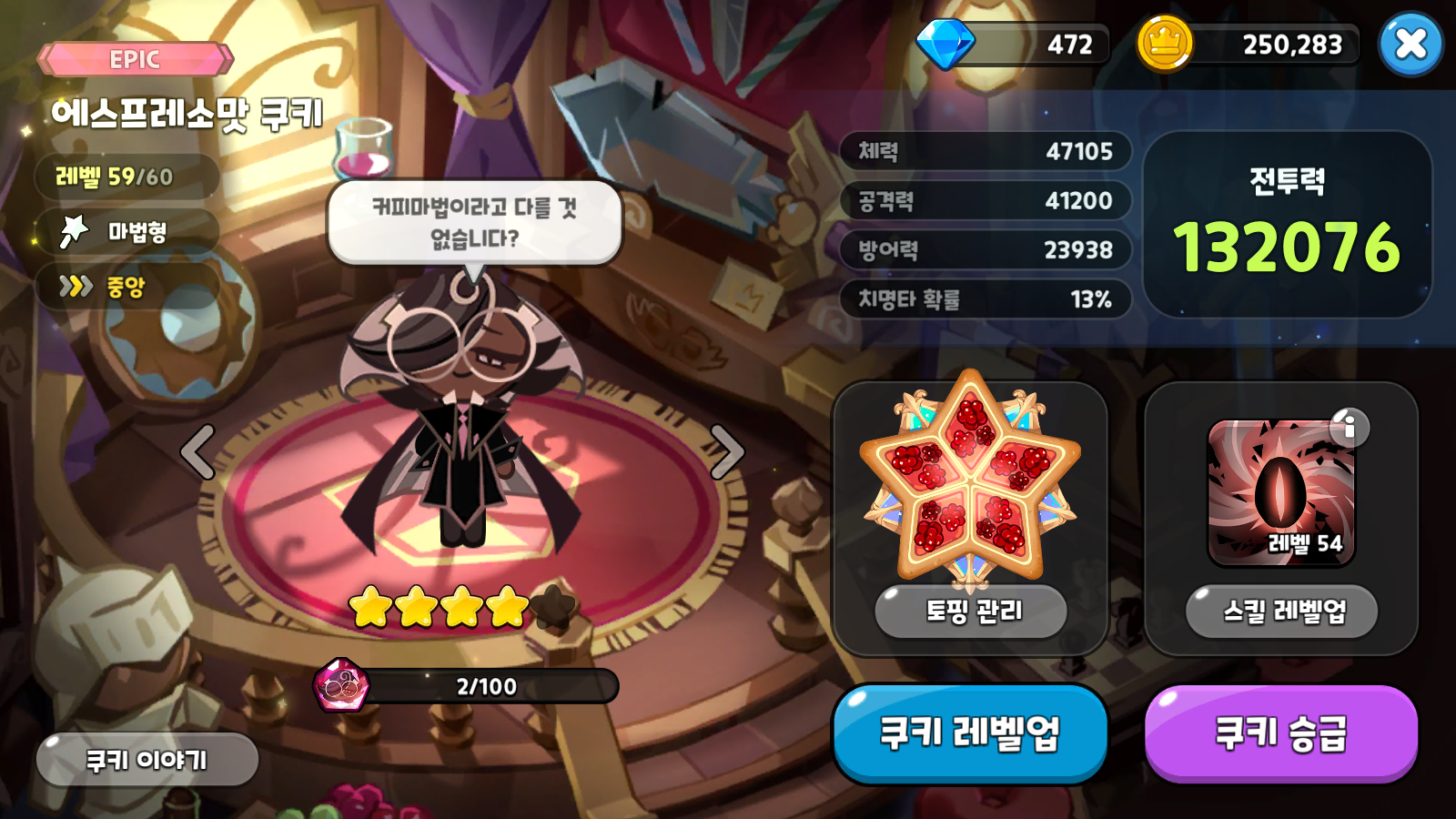 아레나를 휩쓸고 있는 에소프레소맛 쿠키, 무과금이지만 열심히 키웠다. 곧 있으면 레벨 60 만렙을 앞두고 있고, 무엇보다도 벌써 4성을 찍었다. 앞으로 에소프레소맛 쿠키 영혼석을 98개만 모으면 그야말로 더 이상 손댈 필요가 없다. 물론, 토핑을 조금 더 좋은 걸로 장착해야겠지만, 적어도 지금 토핑들은 추옵으로 모두 공격력 증가 옵션이다. 그래서 정말 공격력이 좋다.