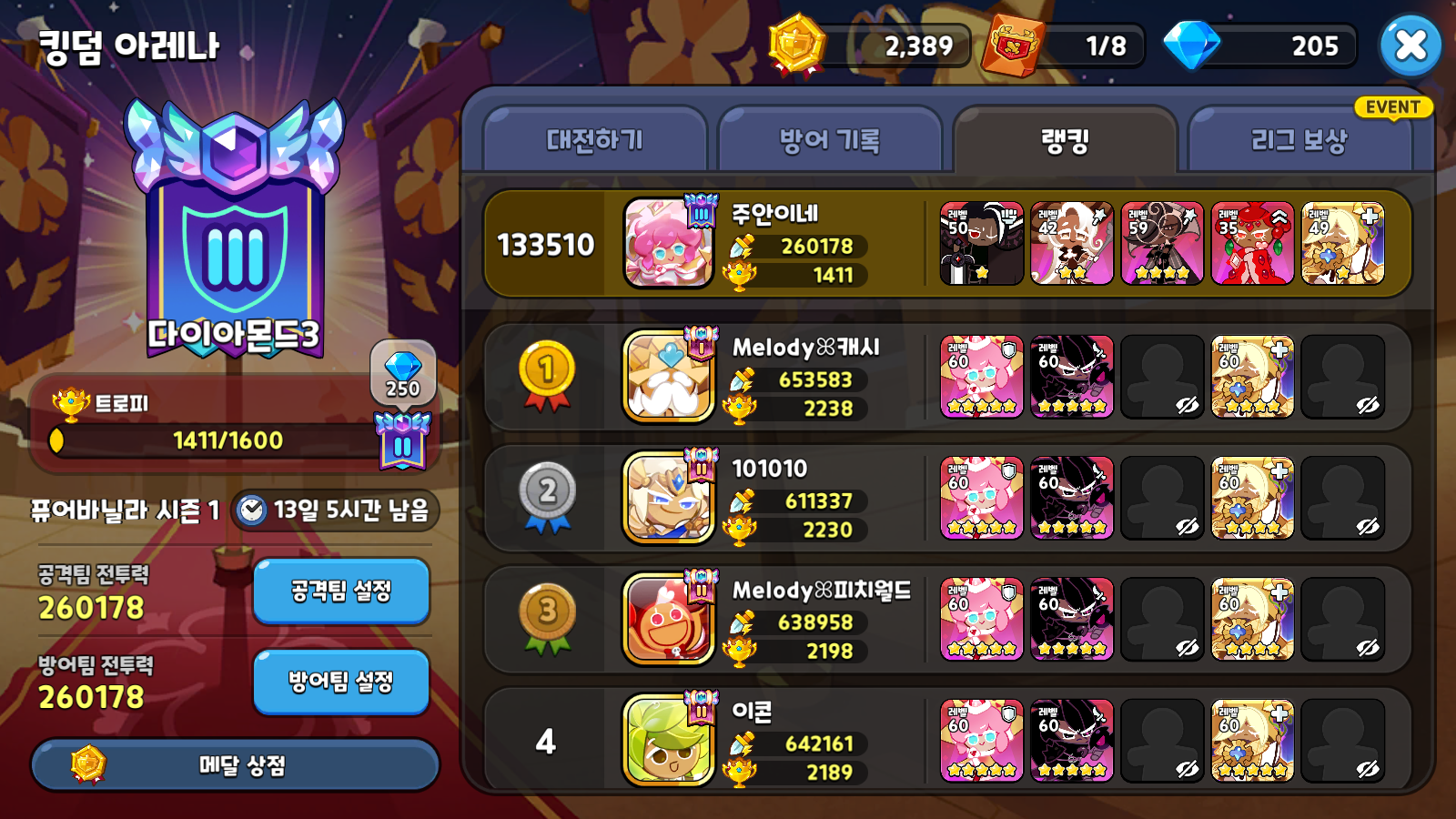 신규 에피소드 상당히 강하다. 위의 덱으로는 어림도 없다. 물론 석류맛 쿠키 빼고, 정글전사 쿠키를 쓰면 조금 더 수월하지만, 허브맛 쿠키를 차라리 써서 버텨보는 것도 좋을 것 같다. 아니면 블랙레이즌맛 쿠키를 육성하는 것도 괜찮을 것 같긴 한데, 조금 기다려보는 중이다.
