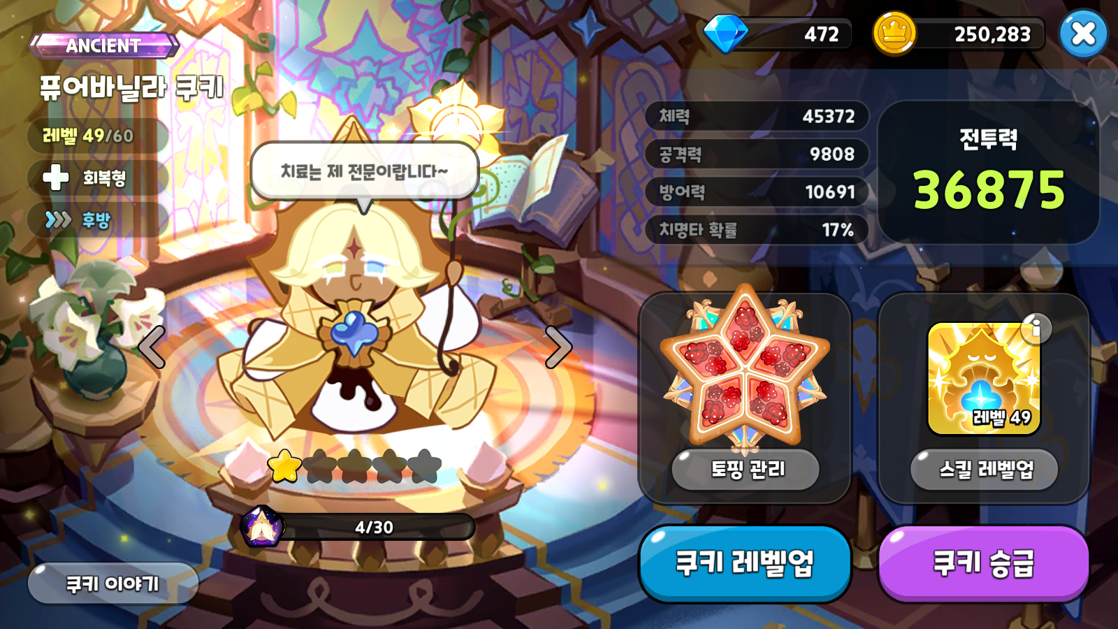 내 덱중에 빠질 수 없는 퓨어바닐라 쿠키, 디버프 해제 효과는 없지만 압도적인 힐량과 보호막으로 덱의 생존율을 높여준다. 일단 공격력 토핑을 사용하긴 했는데, 상황 봐서 쿨감 토핑으로 바꿀 예정이다. 아직 석류맛 쿠키 레벨이 낮아서 힐량도 적고 일단 가지고 있는 강화 공토핑을 사용하긴 했는데, 쿨감토핑 되는대로 적용해볼 예정이다.