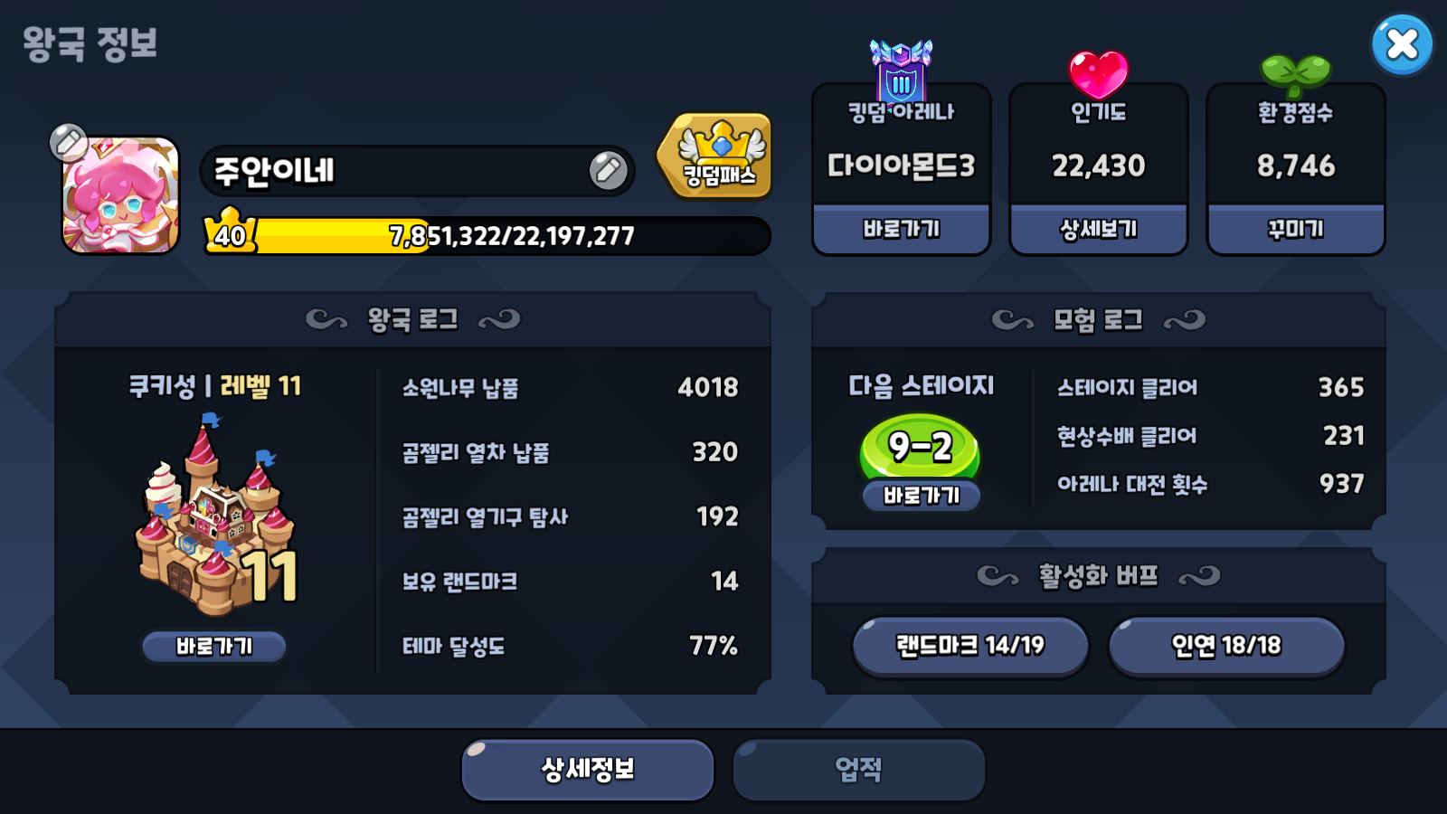 뭐 물론 고인물 현질러 기준으로 턱없이 부족하고, 아레나에서도 꽤 자주 지지만 그래도 아레나 티켓 적절하게 소화할 수 있을 정도 스펙은 되는 것 같다. 그렇지만, 언제까지 쿠키런 킹덤을 즐길 수 있을지는 의문이다. 이제 슬슬, 조금 꾸미는 재미를 찾아보는 것도 좋을 것 같다.