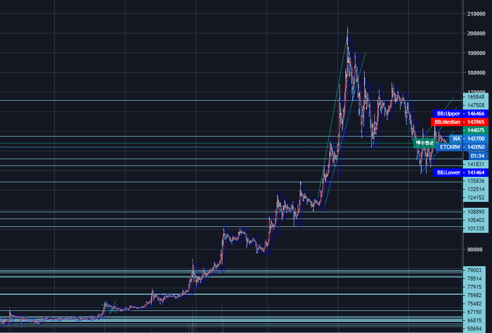 최근 급등했던 이더리움 클래식(ETC)의 차트다. 가로줄로 저항선과 지지선, 박스권 등을 구별하느라 차트가 다소 지저분하지만, 만약 엘리어트 파동 이론을 적용했다면 가장 큰 수익구간을 놓쳤을지도 모른다.