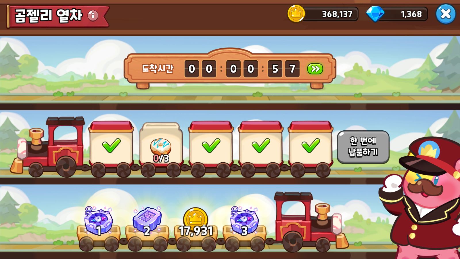 문제의 곰젤리 열차, 항상 재료가 부족하다. 뭔가 쿠키성 레벨도 올리고 건물 레벨도 올릴수록 곰젤리 열차 납품이 쉬워져야 하는데, 소원나무도 그렇고 안 하느니만 못하는 것 같다. 이 부분은 정말 해결해줘야 할 듯싶은데, 재료의 비대칭 때문에 창고도 항상 넘치고 데브시스터즈가 일부로 다이아몬드 결제를 하도록 유도하는 것 같기도 하고, 좀 그렇다.