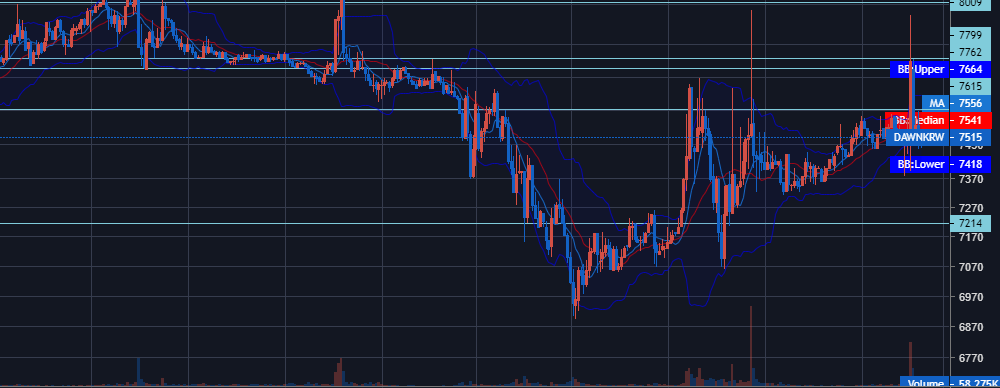 5월 5일 이후로 다시 9,000원대로 회복하지 못하고 있는 던프로토콜, 아니 8,000원 대도 돌파하지 못하고 있다. 5월 9일 이후로 12일까지 4일 동안(9, 10, 11, 12) 8,000원 대를 돌파하지 못하고 있는데, 얼마나 펌핑을 하려고 이렇게 머물고 있는지는 모르겠다. 6,800원 대까지 갔다가 7,500원 까지 가격 회복을 많이 하긴 했는데, 생각보다 매수세가 약하다.
