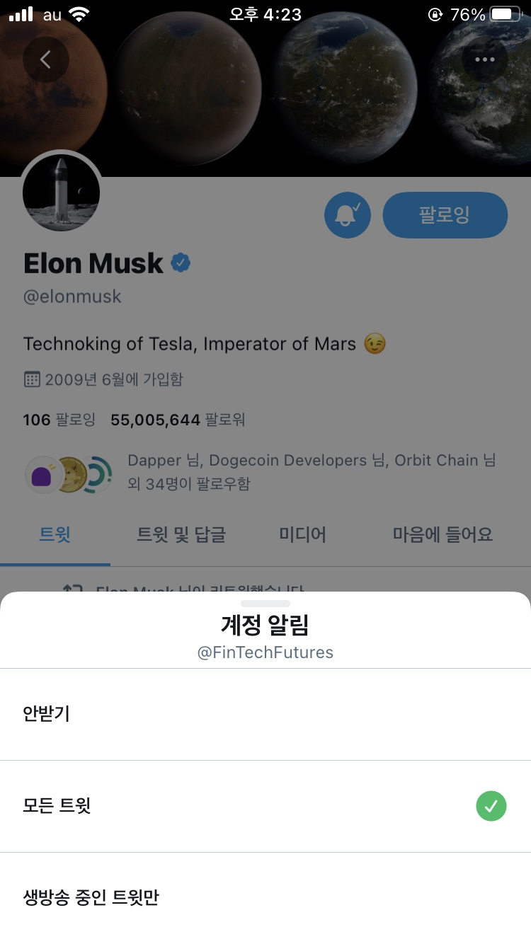 알람만 즉시 확인할 수 있다면, 이 방법은 수익을 낼 수 있는 가장 빠르고 안전한 방법이 될 것입니다. 일론 머스크의 트윗을 놓치지 마세요. 어떤 호재보다 강력하고, 즉시 반영됩니다. 당신이 코인투자를 하든, 주식투자를 하든 일론 머스크의 트윗은 반드시 확인해야 합니다. 시장에 강력한 영향을 주기 때문입니다.