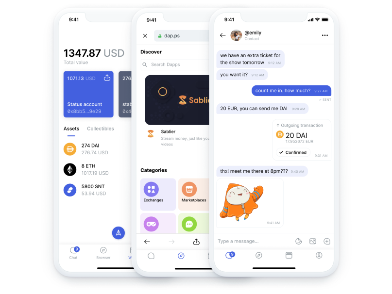 스테이터스 토큰은 이 네트워크에 사용되는 연료 개념으로 이해할 수 있으며, 플랫폼이 지원하는 다양한 시장에서 이용됩니다. 스테이터스 앱은 안드로이드와 iOS에서 사용할 수 있습니다.