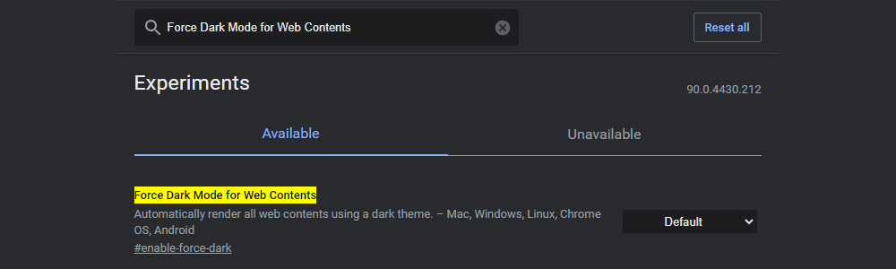 구글 크롬 주소창에 chrome://flags/#enable-force-dark로 접속하면 실험실 기능을 활용할 수 있습니다.