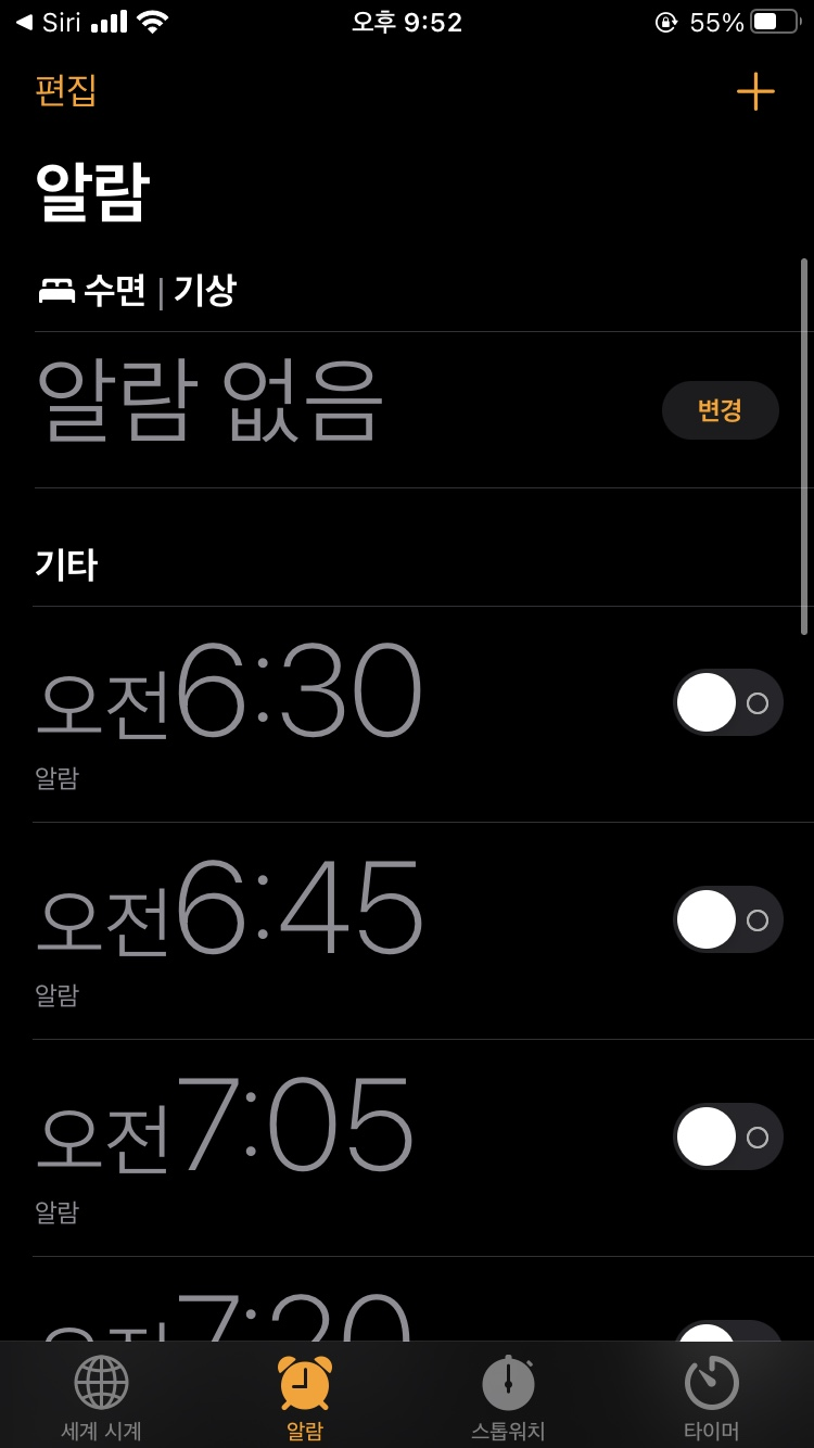아이폰 알람을 삭제하는 것은 간단하지만, 전체 삭제하는 방법은 다소 번거로웠습니다. 하지만, 시리 기능을 활용하면 한 번에 아이폰 알람을 삭제할 수 있습니다. 방법은 간단합니다. 만약, 알람을 5분 간격으로 여러 개 설정했다고 가정할 때, 알람을 한 번에 삭제하려면 '시리'를 켜면 됩니다.