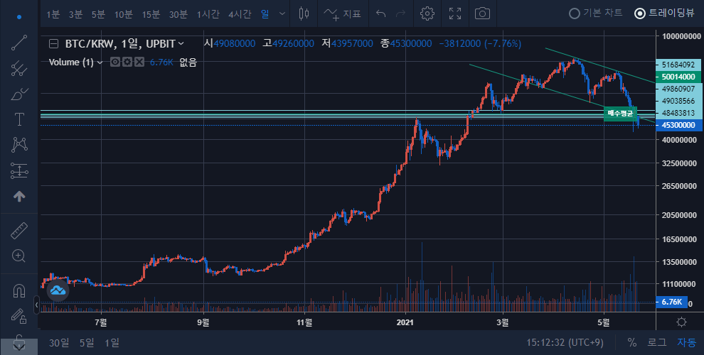 분명한 것은 이전 급등 때와는 다르며, 반등 추이를 계속 지켜봐야 한다는 것이다. 지금 매수를 하더라도 결코 손해보지 않을 지점이라 생각이 되고 조금 더 흐르더라도 다시 가격 반등에 성공하지 않을까 생각한다. 만약, 4,200만 원에서 더 흐른다면 바로 손절을 하고 3,200만 원 지지선 근처에서 매수해볼 만하다고 생각된다.