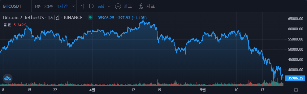 지금 시장에서는 사실 굉장히 혼란하다고 밖에 말할 수 없을 것 같다. 확실하다고 말하면 거짓말이고, 예측한다고 하면 근거가 명확하지 않다. 4월 이후로 하락하고, 반등하다가 5월 중순부터 계속해서 하락세가 지속되는 듯하다. 오히려, 경사가 더 심해지면서 그만큼 패닉 셀이 많이 나온다고 할 수 있겠다. 이는 주식과는 다르게, 코인 시장의 특징을 나타내는 듯하다. 지난 비트코인 급등과 폭락 때와는 다르게 며칠을 두고 천천히, 그러다가 패닉 셀이 나오는 구간에서 가격이 심하게 떨어지는 구간이 나온다.
