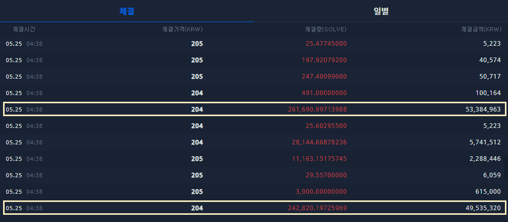 체결 이력을 살펴보니 3억 매도벽을 누군가가 매수했다. 세력이라 하기엔 다소 규모가 작아 크게 펌핑하지 않을 것이라 보고 익절 라인은 20%로 잡았다. 평단가 204원에 누군가 매수하는 것을 보고 나 역시 바로 204원으로 진입했으며, 몇 분 뒤 205원 3억 매도 벽이 모두 소진되었다.