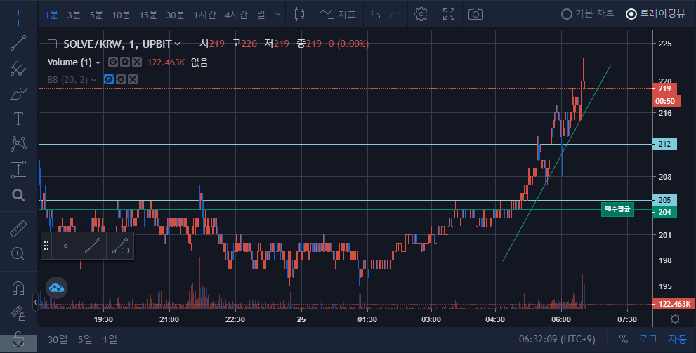 하지만, 생각보다 추후 거래량은 터지지 않았고 천천히 상승을 하긴 했는데, 매수세가 금방 오르지 않아 223원에 내 물량을 매도했다. 아침 첫 매매거래는 약 8% 이상의 이익을 얻을 수 있었다. 익절 구간을 예상하지 못했기 때문에 결과적으로 실패한 매매가 된 것이다.