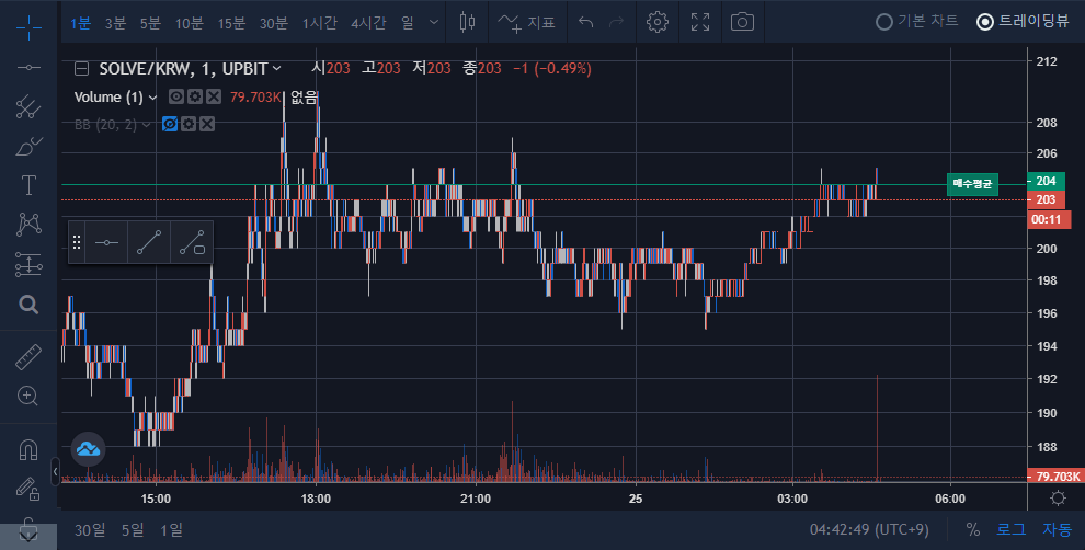 확실히, 이런 경우에는 무조건 확신할 수 있는 자리다. 3억 매도벽이 소화된다는 것은 반대로 매도를 하기 위해선 누군가가 3억을 매수해야 한다는 의미가 된다. 하지만, 가격이 올라갈 것을 예상하거나 혹은 펌핑을 목적으로 매수를 했다면 적어도 204원 이하로는 떨어지지 않는다는 의미가 된다. 이런 부분을 고려해서 매수를 했다. 스캘핑이었다면 가격이 하락했을 때, 매수하는 것이 맞지만, 이 경우에는 올라간다는 신호를 포착했기 때문에 가능한 매수 타이밍이었다.