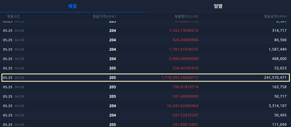 체결 이력을 살펴보니 3억 매도벽을 누군가가 매수했다. 세력이라 하기엔 다소 규모가 작아 크게 펌핑하지 않을 것이라 보고 익절 라인은 20%로 잡았다. 평단가 204원에 누군가 매수하는 것을 보고 나 역시 바로 204원으로 진입했으며, 몇 분 뒤 205원 3억 매도 벽이 모두 소진되었다.