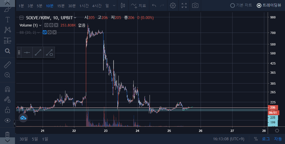 이와는 별개로 다른 알트코인인 솔브케어는 어제 익절을 본 좋은 경험이 있는데, 어제 형성한 차트와 비슷한 차트가 다시 한번 등장했다. 10분 봉으로 전체 흐름을 살펴볼 때, 괜찮은 진입구간이라고 생각이 들지만 다소 신중한 상황이다.