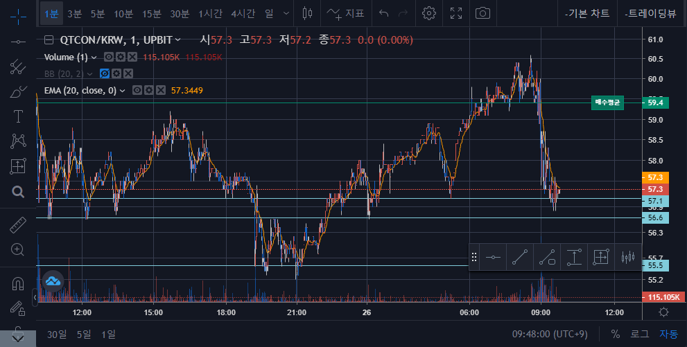 전날에 물량을 모두 매도했기 때문에 오늘은 물량을 매도하지 않고 펌핑을 할 것으로 예상했기 때문에 다소 비싸지만 진입을 한 것이다. 일단 저점 매수엔 실패했기 때문에 세력이 물량을 한번 매도할 것으로 예상한 것은 결과적으로 실패다. 다만, 적어도 한 번 정도는 반드시 펌핑이 있을 것으로 보고 있다. 그 이유는 57원에서 매입을 하고 있기 때문에 적어도 차익실현을 위해서라면 가격을 올려야 하기 때문이다. 특히, 횡보장이라면 가격이 떨어질 이유도 올라갈 이유도 없기 때문에 세력이 슈팅을 할 확률이 높아진다.