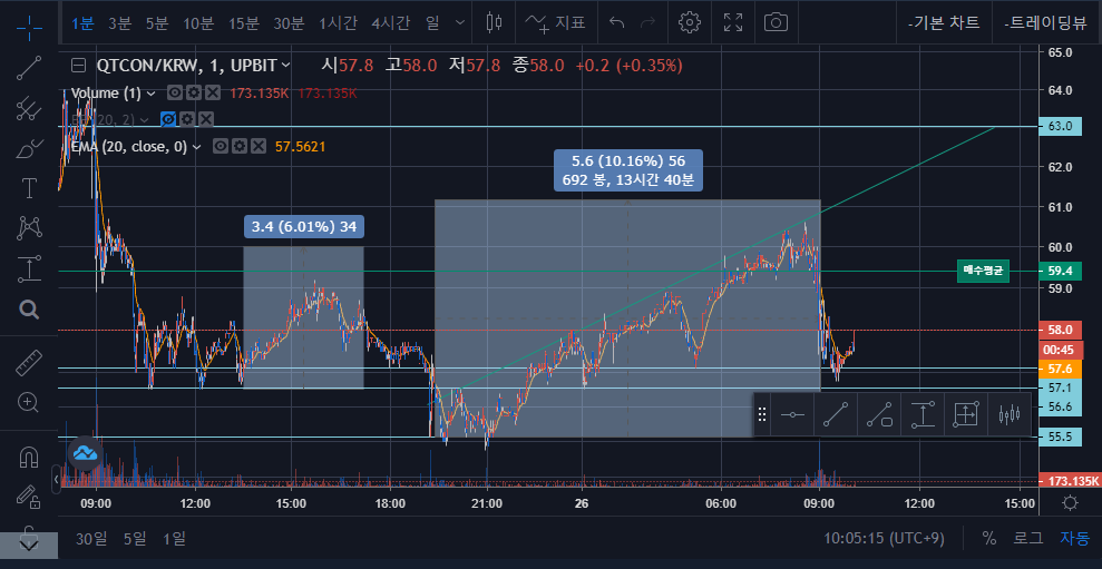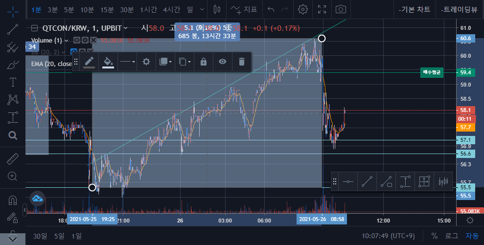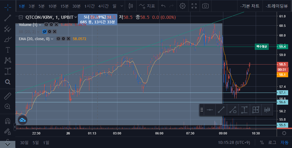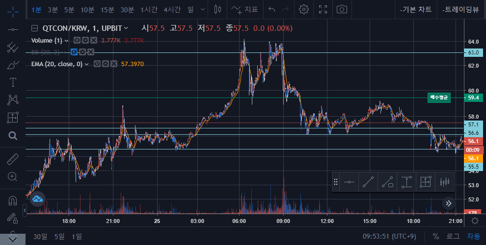 9시 급등주를 노리고 진입한 퀴즈톡, 매수 평단가는 59.4원이다. 퀴즈톡의 경우에는 전형적인 펌핑코인으로 평소에는 진입을 하지 않는 종목이지만, 최근 일주일 동안 9시 패턴을 분석했을 때, 대부분 9시에는 약 10% 이상 펌핑을 했다. 여기서 내가 실수를 했던 부분은 다소 비싸다는 것을 알고 진입을 했고, 손절라인은 -5%로 잡았다. 바로 펌핑을 했으면 좋았겠지만, 세력의 입장에서도 현재가가 부담되었는지 한번 매도를 하고 다시 지지선에서 매입을 하고 있다.