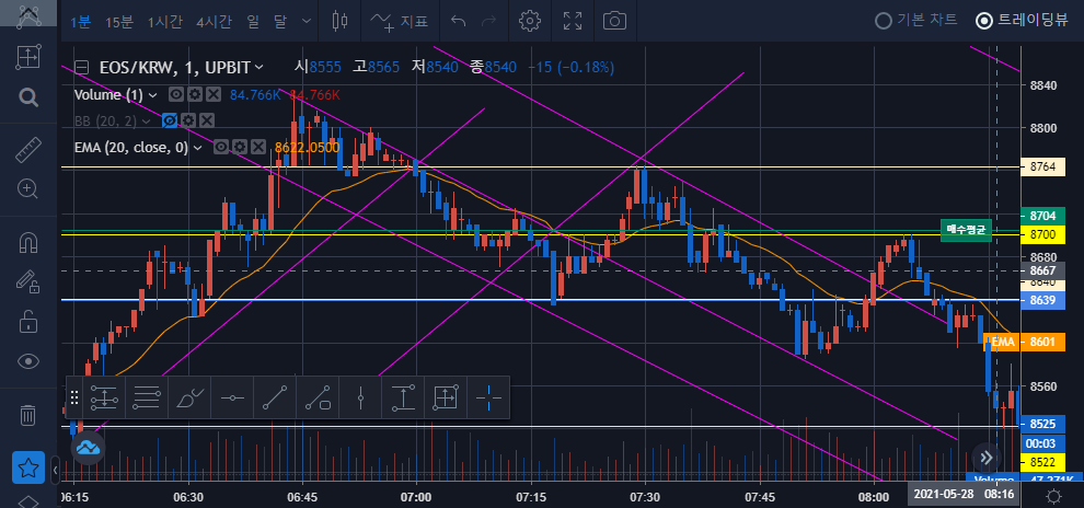 8705원에 매수를 했다. 8765원에서 매도를 했어야 했는데, 매도를 못했다. 이렇게 빨리 반등이 올 줄은 예상하지 못했던 것이다. 익절을 하지 못해도 여기까지는 괜찮다. 하지만, 문제는 8,700원이다. 이미 추세가 바뀐 것을 생각하고 본절 매도를 시도했다. 그리고 적어도 저항선까지는 올라올 것으로 생각했던 것이다.