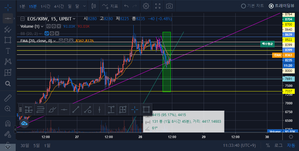 손실이 없지만, 손실을 본 느낌이라는 것이 바로 이러한 점이다. 차트가 일정하게 상승하면 좋겠지만, 일단 15분 봉으로 봤을 때, 계속해서 반나절 이상 횡보장이 지속되고 있으므로 시장이 곧 방향을 잡을 것으로 예상된다.