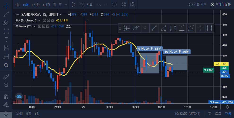 익절 라인은 15분 봉 기준으로 10봉 이하, 2시간 30분 이하로 추세를 살펴보고 익절을 해야 할 듯싶다. 다만, 비트코인의 추세가 갑자기 급락하거나 지지선이 깨진다면 바로 손절을 하거나, 지지선이 깨지고 나서 반등이 나올 때 물량을 빼야 할 것이다. 온톨로지가스의 경우에는 확실한 자리에 진입했다고 생각하지만, 샌드박스의 경우에는 다소 상황을 분석하면서 관찰할 필요가 있다고 생각한다.