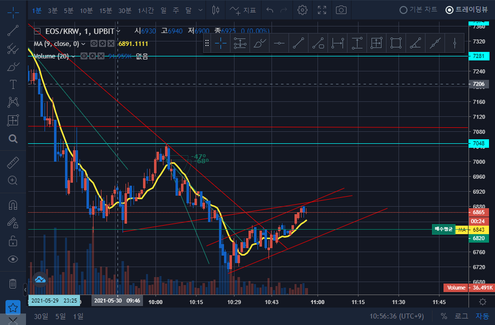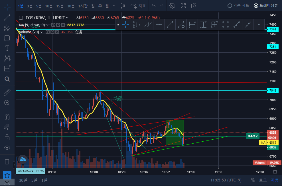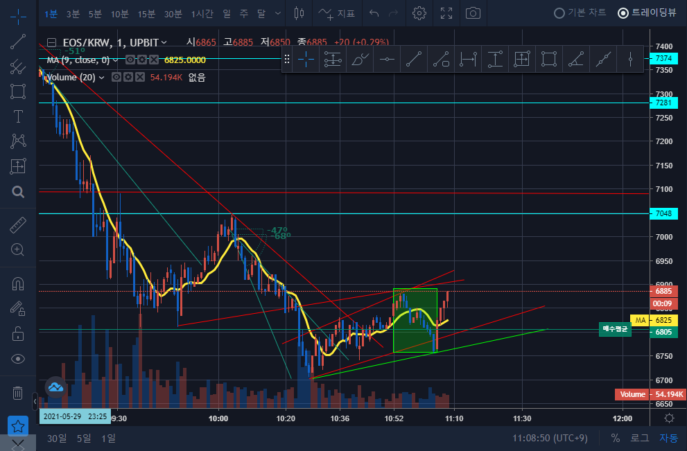 오늘 네 번째 스캘핑은 하락 추세선을 벗어나고 저점이 짧아지고 고점이 높아지는 구간에 매수를 했다. 10:48분에 매수 진입, 10:54분에 매도를 했다. 매도를 원래 6,865원에 하려고 했는데 반등이 1~2분 늦어져서 바로 6,860원에 매도를 했다. 약 0.6% 이익을 봤다. 이후 저점 추세가 유지된다면 한번 더 매매구간이 나올 것이다. 저점에서 체결강도가 높아지고 있으므로, 한번 더 반등이 생길 거라 판단, 하락장이지만, 다시 한번 타점을 잡는다.