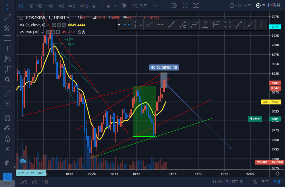 오늘 네 번째 스캘핑은 하락 추세선을 벗어나고 저점이 짧아지고 고점이 높아지는 구간에 매수를 했다. 10:48분에 매수 진입, 10:54분에 매도를 했다. 매도를 원래 6,865원에 하려고 했는데 반등이 1~2분 늦어져서 바로 6,860원에 매도를 했다. 약 0.6% 이익을 봤다. 이후 저점 추세가 유지된다면 한번 더 매매구간이 나올 것이다. 저점에서 체결강도가 높아지고 있으므로, 한번 더 반등이 생길 거라 판단, 하락장이지만, 다시 한번 타점을 잡는다.