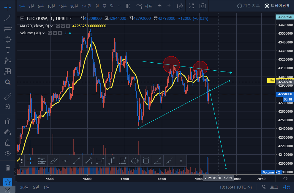 이오스 매매를 하고 있었는데, 지지선을 끼고 매수 진입을 했지만, 고점이 낮아지면서 저항선을 뚫는 힘이 약하다고 판단 이후 바로 매도를 했다. 매도를 하자마자 거대 물량이 매도되기 시작, 추세선을 이탈하진 않았지만 가격이 일시적으로 급락했다. 바로 반등이 나오며, 추세선을 유지해주고 있지만, 업비트에서는 김치 프리미엄으로 가격이 방어되는 듯한 모습을 보여줬다.