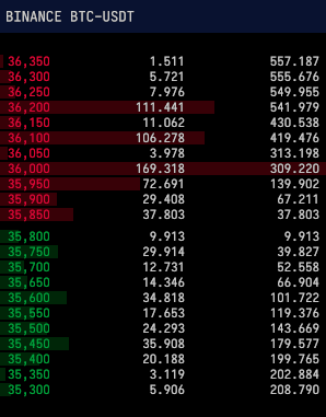 이후, 하락의 근거가 뚜렷하게 보이기 때문에 차트의 변화를 살펴보기로 판단했다. 비트코인 원화시장의 경우, 이후 추가적으로 김프가 빠지면서 2차 하락이 시작됐다. 반등이 나오긴 했지만, 매도세가 강하기 때문에 추가적으로 많은 매도 물량이 나올 것으로 보고 있다. 이 부분에서 상승하기 위해서는 다시 한번 36K를 뚫어주는 강한 매수세가 나와야 하는데, 마켓 뎁스나 호가창을 보더라도 쉽지 않아 보인다.