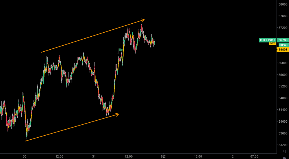 36K 저항선에서 숏포지션을 잡았고, 고배율로 포지션을 잡았기 때문에 어찌보면 운이 나빴다고 할 수 있겠다. 하지만, 나는 오히려 기분이 나쁘지 않았다. 청산을 당하고 나서 잠시 매매를 쉬고 개들을 데리고 집 근처 공원을 산책하면서 곰곰이 생각했다. 추세전환의 시점이 찾아온 것은 아닐까? 하고 말이다.