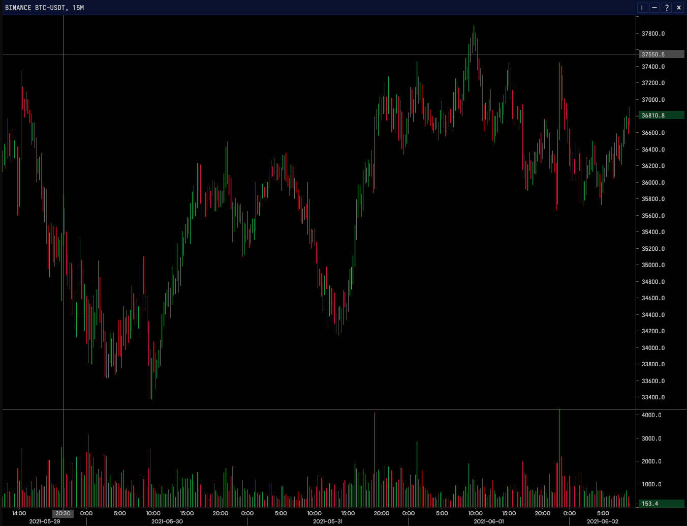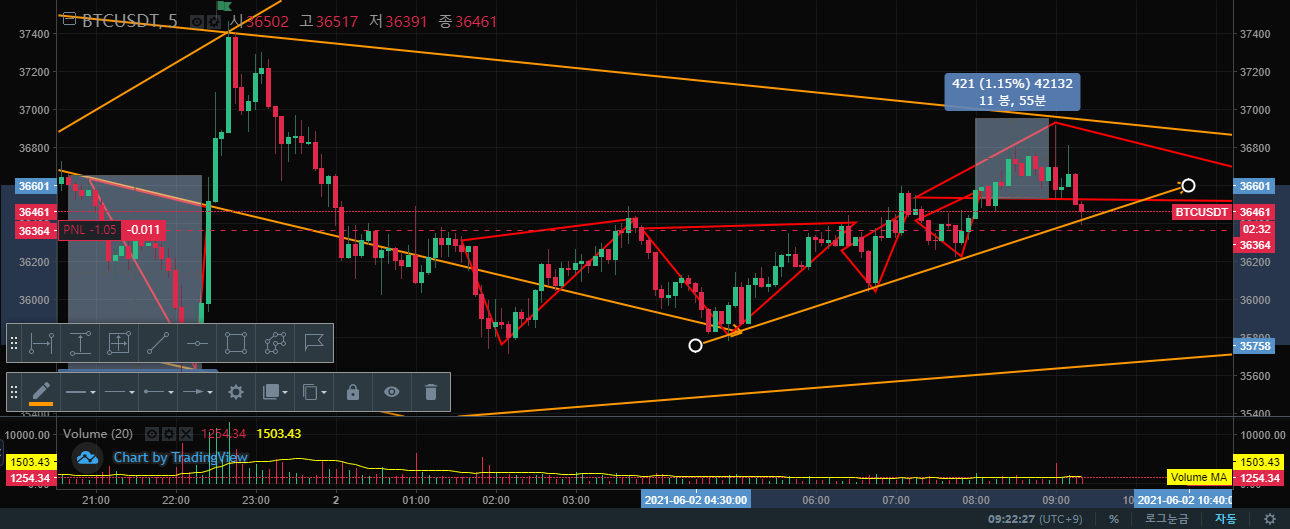 물론, 업비트에서 바이낸스로 입금을 해야 할 때는 트론을 사서 보내고 있다. 체감적으로도 트론이 수수료가 가장 저렴한 듯하다. 원래는 이오스로 보내고 있었는데, 익숙해서 이오스로 보냈지만, 생각해보면 굳이 이오스로 보낼 필요는 없는 듯하다. 어쨌든 간에 청산 이후로 재밌게 다시 매매를 하고 있어서 일단 즐거움을 많이 느끼고 있다. 6월 시장의 경우에는 많은 사람들이 상승 장세를 유지할 것이라고 예상하고 있어 장기추세선을 기준으로 상황을 주시하고 있다. 아마, 그 첫 번째 슈팅이 오늘 단기 추세의 방향을 잡을 것이라고 생각한다. 비트코인의 35.5K에서 점차 1K 정도 끌어올렸지만, 과연 37K를 다시 뚫고 올라갈 수 있는지가 중요한 포인트가 될 것이다.